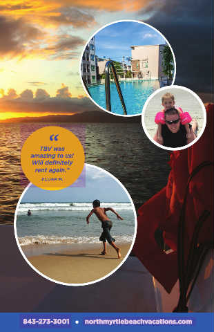 “ TBV was amazing to us! Will definitely rent again.” JILLIAN M. • 843-273-3001 northmyrtlebeachvacations.com